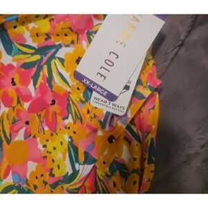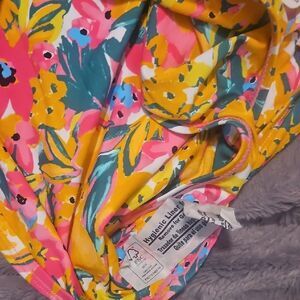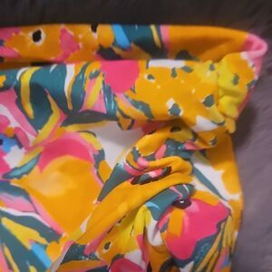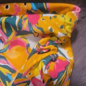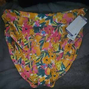 Vibrant floral bikini bottom with pink, yellow, and green hues. Perfect for a sunny day at the beach.