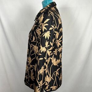 This striking jacket from Anne Carson is a luxurious statement piece! The shell is made from exquisite 100% Pure Silk in black, featuring a vibrant metallic gold/tan bamboo and vine print.