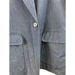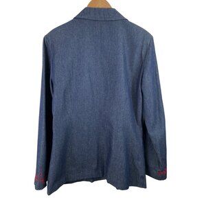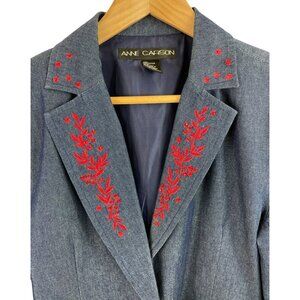 Anne Carson Blue Denim Blazer Womens Size Medium Embroidery Floral Jacket Pocket