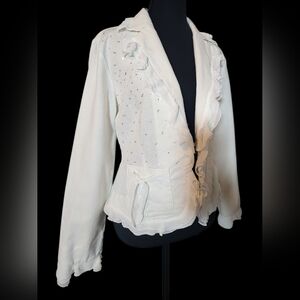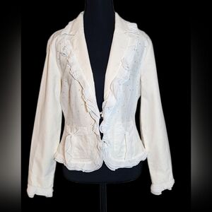 Chic cream blazer with ruffled edges. Perfect for elevating any look.