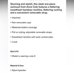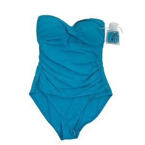 New with tags Size 8 M Arctic blue Removable strap included Stunning and stylish, this sleek one-piece swimsuit from Anne Cole features a flattering sweetheart bandeau neckline, flattering ruching • Imported • Non-removable cups • Moderate bottom coverage • Pull on styling • Sweetheart neckline with twist; ruched sides • Lined Size & Fit • Model is wearing a size 6 Material & Care • Nylon/spandex