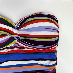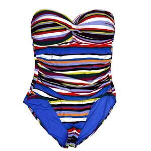 Anne Cole Easy Breezy Stripe Twist Front Shirred One-Piece Swimsuit in Multicolor. This bandeau-style suit features a twist front detail and shirred sides for a slimming, feminine silhouette. With built-in boning and silicone elastic at the neckline, it stays comfortably in place—even without straps. The adjustable, removable strap adds versatile styling, making this a perfect pick for soaking up the sun in style.