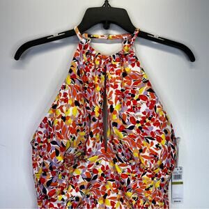 Anne Cole Ruffled Strap Keyhole One-Piece Swimsuit in a coral ditsy print. Vibrant floral pattern for a playful and feminine look. Designed with a high neckline and a charming keyhole detail, this swimsuit offers a modern yet elegant silhouette. The delicate ruffled back straps add a stylish touch, enhancing the overall design. Featuring removable cups, it provides customizable support and comfort. Perfect for beach days or poolside lounging!