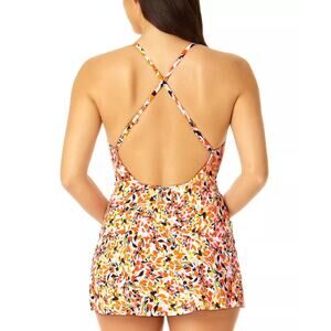 From the Whirlpool Ditsy collection, this one-piece swim dress features a vibrant multicolor floral print with a skirted bottom. It has a flattering v-cut neckline, cross-back adjustable straps, removable cups, and gold ring hardware for added detail. A supportive and stylish choice for poolside lounging, vacations, or resort getaways.