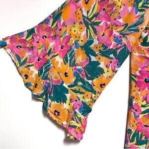 Elevate your beach style with the Anne Cole swim coverup, featuring a vibrant pink and yellow floral design. This airy coverup boasts a flattering V-neckline and flowy sleeves, perfect for a chic and comfortable look by the pool or on the sand.