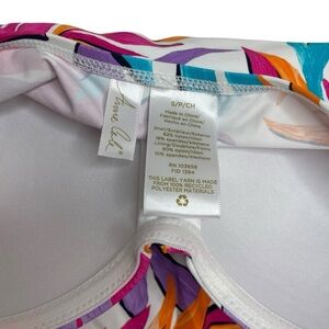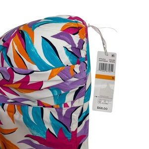 Color: white background with blue, orange, purple, and pink palm tropical leaf print with solid navy blue contrast