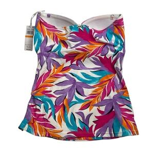 Top: bandeau tankini top, there are notches to add straps but the strap is NOT included, non-removable cups, hits at hips, pulls on, sweetheart neckline, front twist detail
