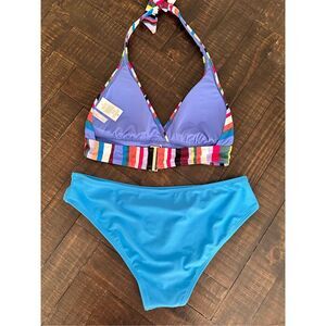 Anne Cole and Wild Fable Blue and Colorful Stripe Bikini Size Medium. Top has some discolorations that may come out, otherwise in new without tag condition. Bottom new with tags.