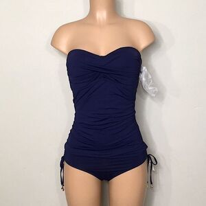 Built-in soft pads and removable straps Bottoms are hipster style. Full coverage. Bottoms Have a beautiful ruched detail on the sides with drawstring and gold emblem. It’s a darker navy color.
