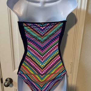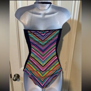 Bright and fun one piece swimsuit with a vibrant multicolor pattern. Perfect for pool days and beach adventures. Removable pads, excellent condition