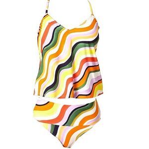 This Stylish Two-piece Swimsuit From Anne Cole Features A Vibrant Multicolor Stripe Print That Is Sure To Turn Heads. The Tankini Top Has A Comfortable And Flattering Fit, With Adjustable Straps And A Shirred Bust For Added Support. The Banded Mid-rise Bikini Bottom Provides