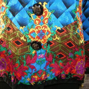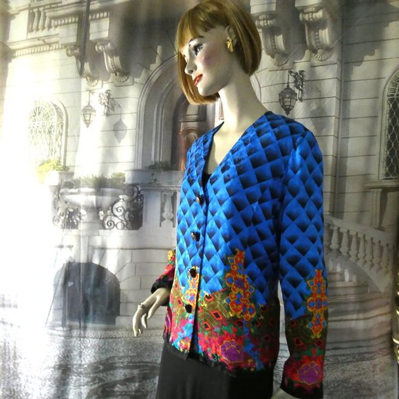 Condition – Excellent condition – V neck blazer jacket with four sculpted buttons silk outer and silk lined with colorful designs on the lower sleeves and at the hem