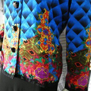 Anne Crimmins Silk Blazer Jacket Silk Lined Size 16 Blue with Rainbow Color Designs on Sleeves and Hem