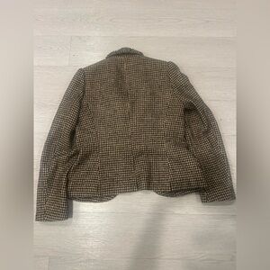 This is an Anne Fontaine Blazer in a houndstooth pattern with ruffle accents and puffed sleeves, made from a wool blend material. The blazer is a size 40 in European sizing, which corresponds to a US size M for women. The black and brown color combination adds a sophisticated touch to the blazer, making it a stylish and unique addition to any wardrobe.