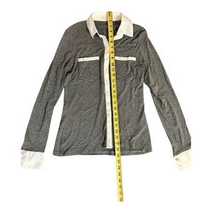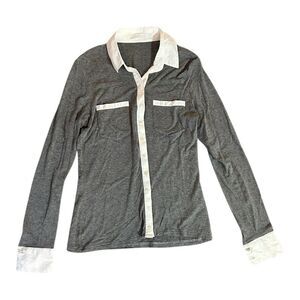 This sophisticated top features a classic button-down style with a notched collar, combining a sleek gray body with crisp white accents. The long sleeves and tailored fit offer a polished look, perfect for both formal and casual occasions.