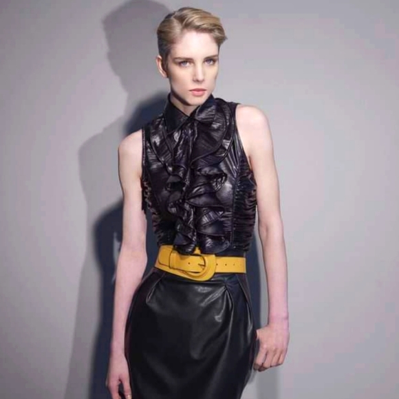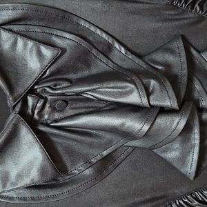 Amazing ruched and ruffled buttoned up top. I guess you can also use it as a vest, that's up to you. The wet look, makes you think it's leather, but it's not, super soft to the touch.