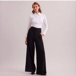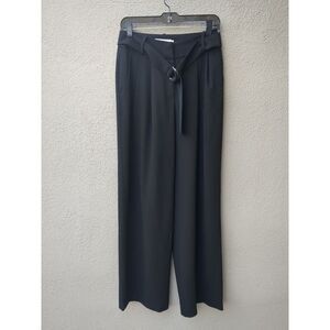 Anne Fontaine Lennon pants in women's size 36 (US size 2) are black maxi trousers made of fluid crepe fabric. They feature a high-rise waist with a pleated front and wide-leg style. The pants are belted, have pockets, and are wrinkle-resistant and breathable. They are suitable for wedding, party/cocktail, formal, and business occasions. The closure is a combination of zip and hook & eye. The inseam is 32 inches, and the waist size is 28 inches. The pants are machine washable. They are designed for a relaxed fit and are not vintage. The brand is Anne Fontaine, and the model is Anne Fontaine Lennon pants. The pants have a classic designer and old money theme.