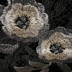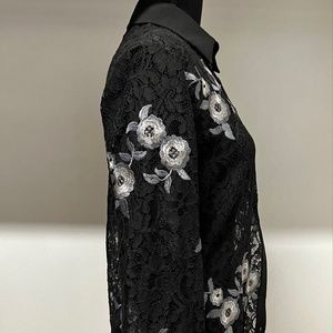 Sheer Black Lace Anne Fontaine Long Sleeve blouse with light blue and silver embroidered floral patterns. This luxurious piece features a point collar, center button placket and French cuffs. It is a size 36.