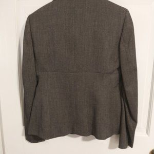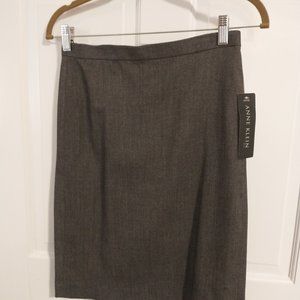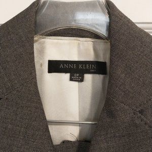 Charcoal grey 0 petite Anne Klein suit. Skirt was never worn and still has tag. Jacket has been worn and sadly has pit stains. Price is reduced in order to pay for dry cleaning. I am not sure if the stains will come out or not. There is zero odor so it might have already been dry cleaned once. It has been stored in a pet free home for the past 8 years, before that it was in a house that had wire fox terriers. There is no visible dog hair, and it has not been around dogs for 8 years, but I just give the warning in case of allergies.
