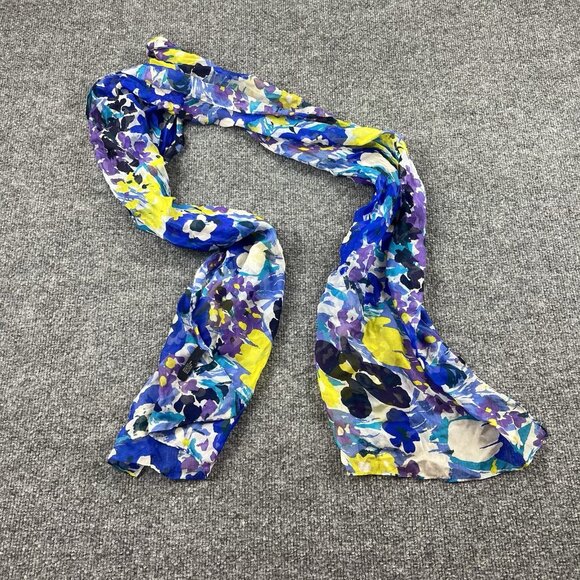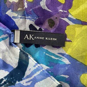 Elegant Anne Klein 100% silk scarf featuring a vibrant floral print in beautiful shades of blue, purple, yellow, and white. Soft, lightweight, and luxurious — perfect to add a touch of color and sophistication to any outfit.