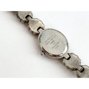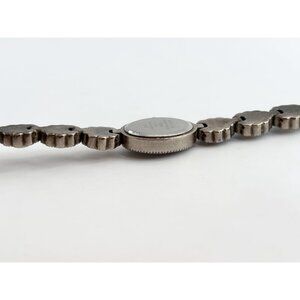 This is a silver toned vintage Anne Klein wristwatch. The bezel is oval shaped.