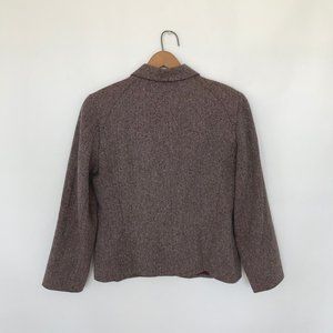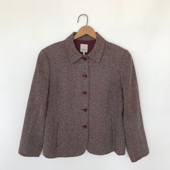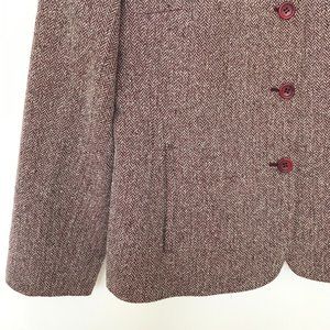 Button-up maroon/gray herringbone lined blazer in excellent condition. Content tag marked 49% silk/30% wool/21% nylon. Pockets, darts, tailored look. Marked size 8.