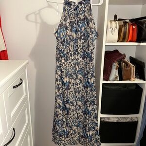 Stylish midi dress by Anne Klein. Features a blue and white pattern. Halter neckline with a flattering fit.