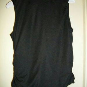 This is the black cross front, wrap gathered stretched rosette top. The top gathers on each side, there are rosettes that extend from the top of the left shoulder. It's low cut with a "V" shape that falls into a drapery cross front, & items can be placed in the lower waist area as if it's a pocket. Length: 21", Shoulders: 13.5" (27" doubled); Chest: (36" doubled), Waist: 15.5" (31" doubled). Double layer polyester; Turn garment inside out & hand wash cold, lay flat to dry.