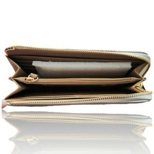 Anne Klein wallet. Features a zip compartment and multiple card slots. Cream/brown color.