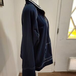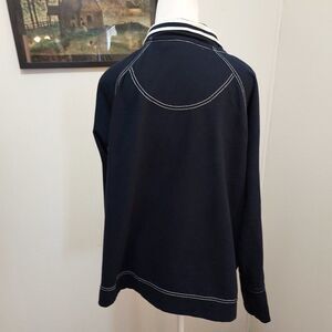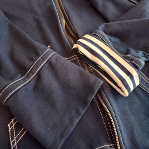 Black and white zip up Jacket If you cuff sleeves it shoes black and white on bottom { see pic} long sleeves blue and around collar and botton Kangaroo type pouch hand warmer 77% Cotton/Alodon Cotton 23 % Polyester