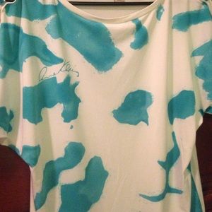 Look closely and you'll notice the pattern is the Anne Klein Lion logo. Cute button shoulders and sleeves for that cold shoulder style. Full and flowing, looks really cute belted! Small but would fit medium as well.