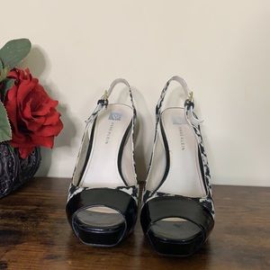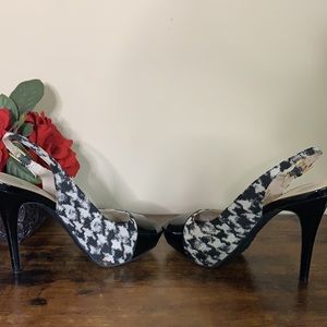 Beautiful black and off-white colored heel with patent leather trim. Has a vintage peep-toe style that really classy. Gently used preloved condition.