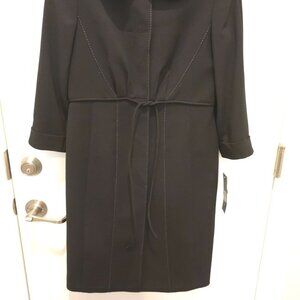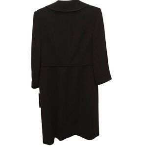 A sophisticated 2 piece black coat and skirt featuring a classic Peter Pan collar, button-down front, and tailored waist tie. Ideal for professional or formal settings, this Anne Klein design combines timeless elegance with modern craftsmanship. The high-quality material ensures comfort and durability for everyday wear. Coat and skirt art fully lined for comfort and easy of wearing.