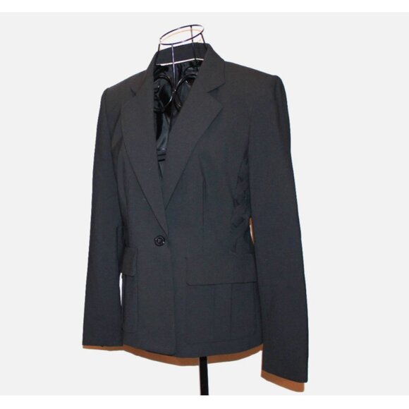 Anne Klein black blazer with a button in front, pockets, embellishments on each side, full lining. Size 6 petite, bust is 36", length is 23", sleeve length is 23", shoulder seam to shoulder seam in back is 16". Fabric is polyester/viscose/elastane. In excellent condition, no signs of wear.