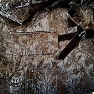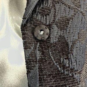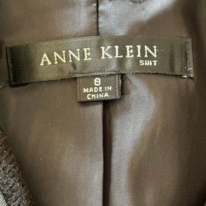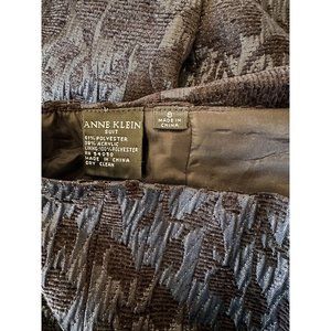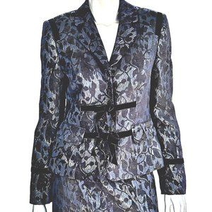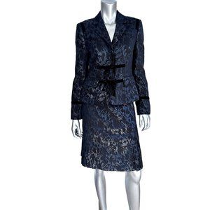 Step up your style game with this Anne Klein Black Brocade Jacquard Skirtsuit with Velvet Bow Details. The classic yet trendy design exudes a classy and chic vibe, making it perfect for any formal occasion. The intricate brocade jacquard fabric adds a touch of elegance, while the velvet bow details give it a stylish edge. This suit will turn heads whether you're headed to a business meeting or a fancy dinner party. Get ready to impress with this Anne Klein classic suit.