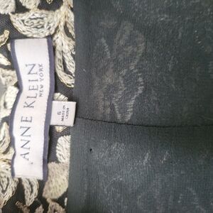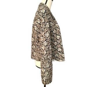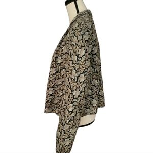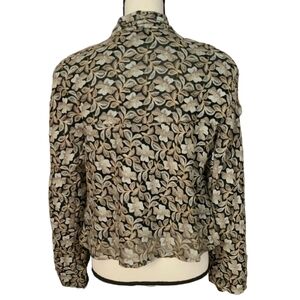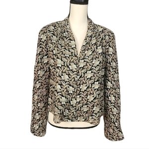 Anne Klein black jacket featuring embroidered leaves and flowers in greenish-gray and gold threads.