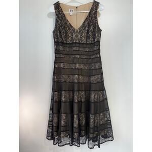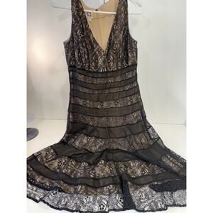 Elevate your wardrobe with this stunning Anne Klein Size 4 Lace Fit & Flare Dress, designed with timeless elegance and flattering structure. Featuring a deep V-neckline, striped sheer lace panels, and a nude underlay that creates gorgeous dimension, this dress delivers the perfect blend of classic sophistication and modern femininity.