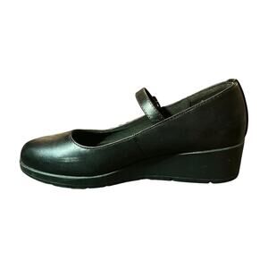 Elevate your wardrobe with these classic Anne Klein black leather Mary Jane wedge heels in size 7M. Crafted from genuine leather, they feature a timeless round toe and a secure strap closure, offering both style and comfort. The moderate wedge heel provides a subtle lift, making them ideal for all-day wear.