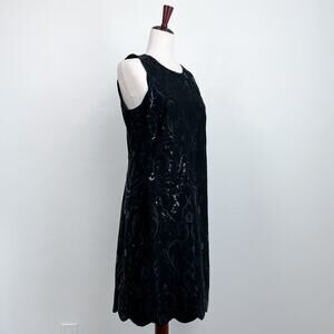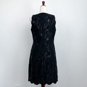 Size 4 Anne Klein sleeveless dress. Black fabric with floral embroidery and embellished with sequins. Scallop edges along the arm holes and bottom hem. Fabric has some stretch. Back zipper. Lined. Great condition!