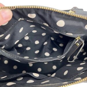Anne Klein Black Structured Double Handle Dome Satchel Purse Bag. In preowned condition: some light marks to the outside and spots on the inside lining (please see all circled pics). Also the bag was stored folded up, so there is currently a fold line in the middle of the bag. Polka dot fabric satin feeling lining. Very structured faux saffiano leather. Double handles. Zipper opening. Gold tone hardware.