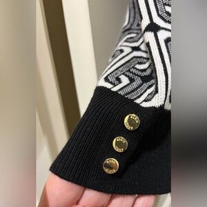 Anne Klein Black & White Geometric Pattern Long Cardigan Sweater. Size XL. Built In Black Tank (tank is the front only). 3 Designer Anne Klein Embossed Logo Stamped Buttons on Each Sleeve. 3/4 Sleeves. Measurements laying down flat: Pit to Pit: 25”. Pit to end of sleeve: 17”. Nape to hem: 31”