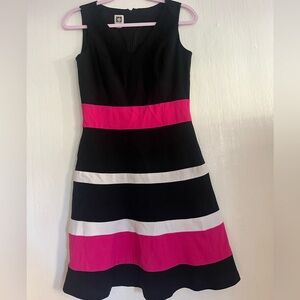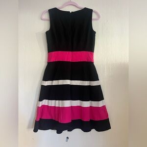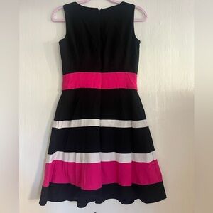 Chic mini dress with bold black and pink colorblock design. Sleeveless style with a flattering fit.