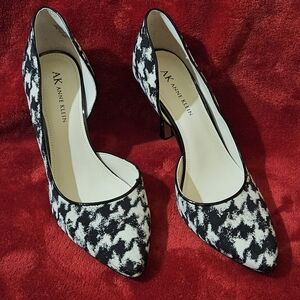 These Anne Klein heels feature a striking black and white houndstooth pattern, offering a sophisticated and timeless look. With a pointed toe and medium-height heel, they are perfect for professional or dressy occasions. The light-colored interior adds a touch of elegance to these classic shoes.