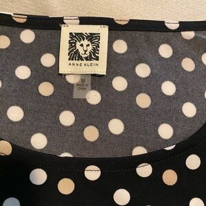 This elegant blouse by Anne Klein features a classic black and white (and a few khaki - see close ups) polka dot pattern with ruffled 3/4 sleeves, offering a sophisticated touch to any outfit. The soft, flowing fabric ensures a fairly loose, comfortable fit, making it ideal for both casual and business casual settings.