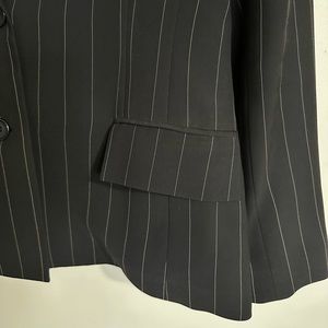 Anne Klein classic blazer with versatile pin stripe design. Black with White Pin Stripe, Two-Button Front/Three Button Sleeves, Shoulder Pads, Lapel Pocket and Two Front Flap Pockets, Back Pleat