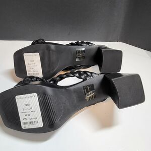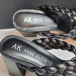 Anne Klein black open toe high heeled sandals. Size 11. 4" heels. These shoes have never been worn before but there is a little infraction on the heels...as shown in the last photo.