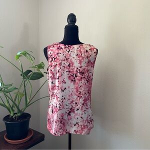 AK Anne Klein, pink black and white multicolored flowy tank with gathered neckline. Features darting in the bust, allowing for bigger chests. Silky feeling polyester. Size Medium. Pulls present.