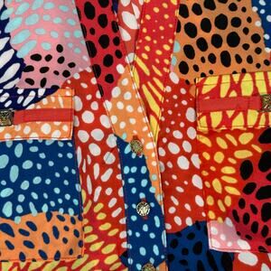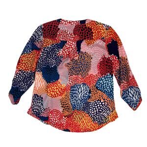 Brighten your wardrobe with this stunning Anne Klein Women’s Blouse featuring a vibrant multicolor patchwork print with playful polka dots and abstract patterns. Designed with 3/4 roll-tab sleeves and gold-tone accent buttons, this blouse offers both chic style and comfort. Lightweight and versatile, it’s perfect for work, brunch, or casual outings.