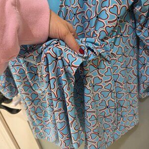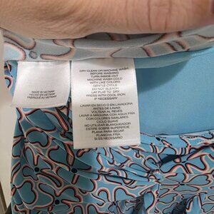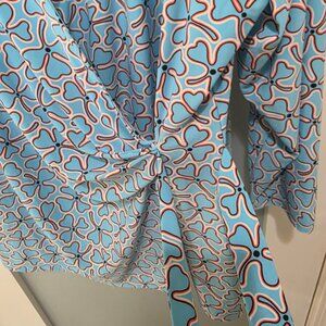 Anne Klein blouse, wrap blouse, printed long sleeve top, geometric print blouse, blue red white shirt, office blouse women’s, Anne Klein top, v-neck wrap top, elegant workwear, classic women’s blouse, tie waist top