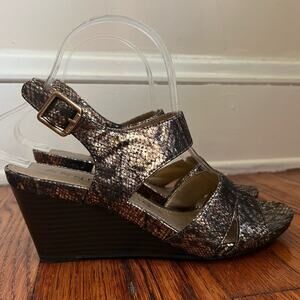 Bronze, brown & black snakeskin print wedge heels by Anne Klein I-Flex in excellent used condition, no noted flaws